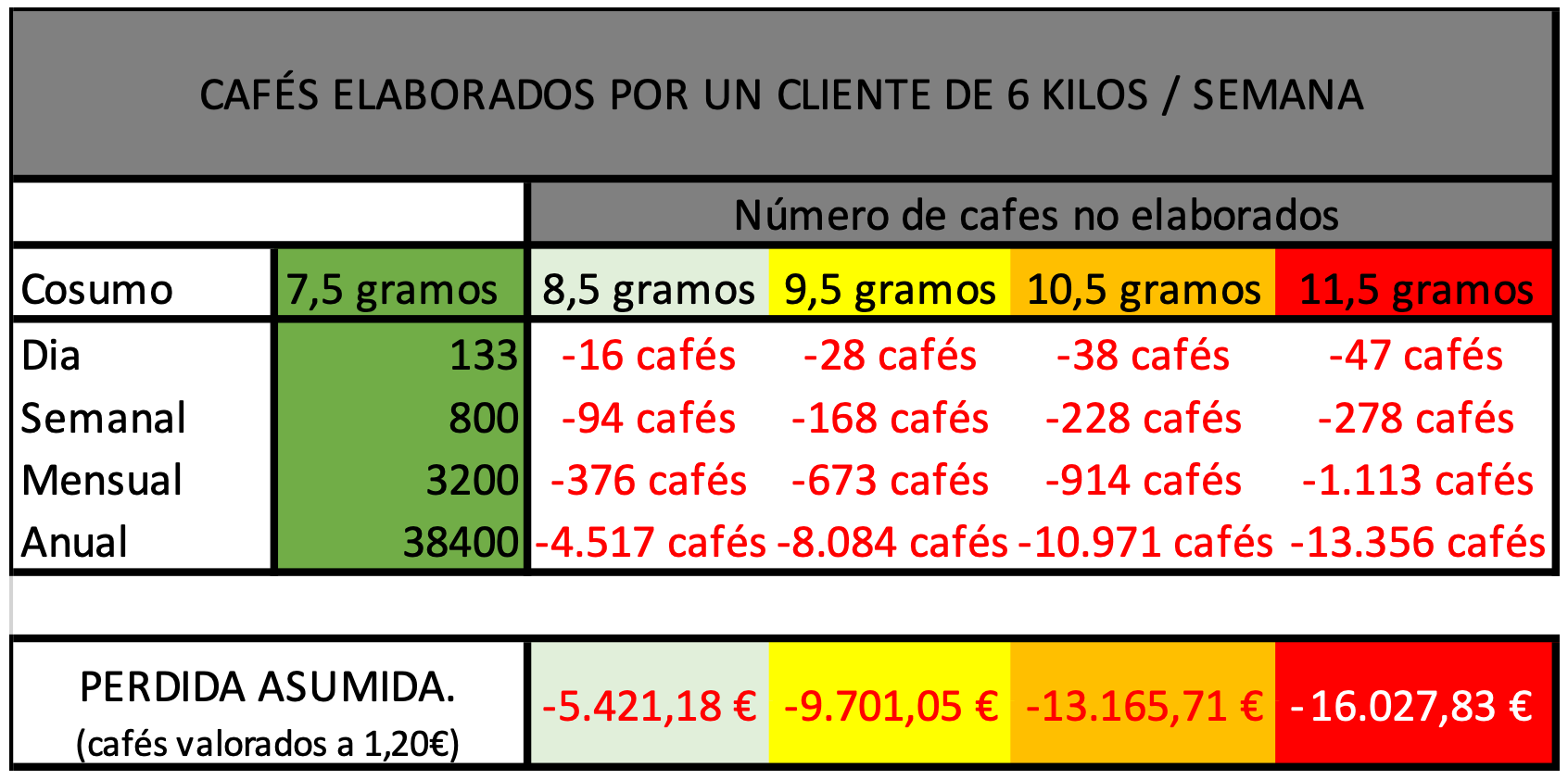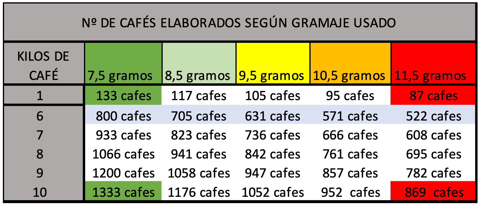 If we read from left to right, according to our weekly consumption, we see how the number of coffees per kilo is lost, which decreases our profitability. and they force you to buy more coffee, spending more money to be able to make the same cups as us.